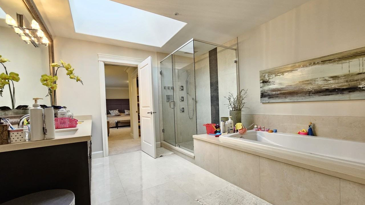 The top floor offers four generously sized bedrooms with bay windows. Two of the bedrooms feature private ensuites, including the master bedroom with a king-size bed.