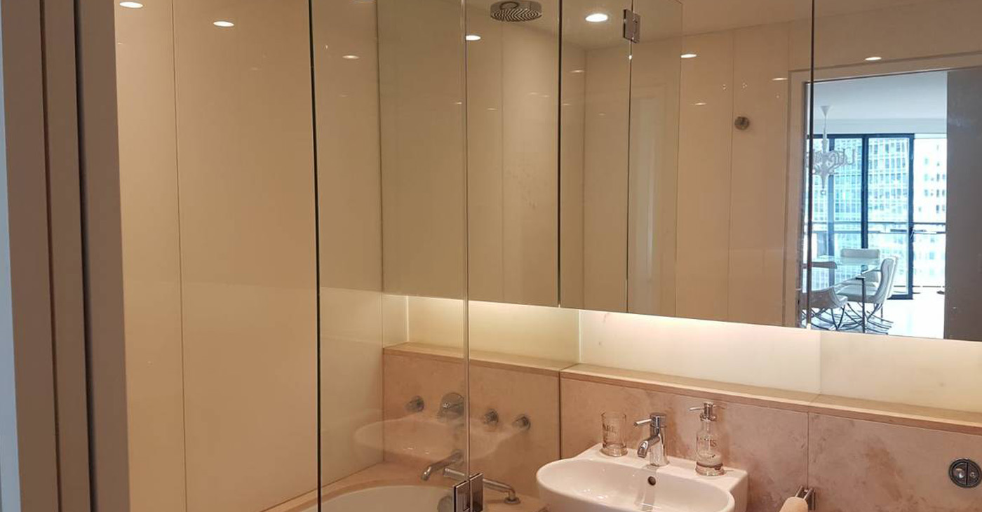 - Built-in frameless mirrored vanity units.